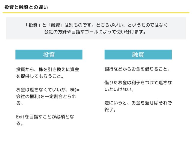 一方で、投資は、株と引き換えに資金を得ることで、返す必要がありません。