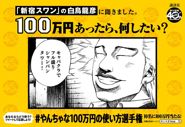 その名も "ヤングマガジン40周年企画「あなたは100万円あったら何したい?」#やんちゃな100万円の使い方選手権"。