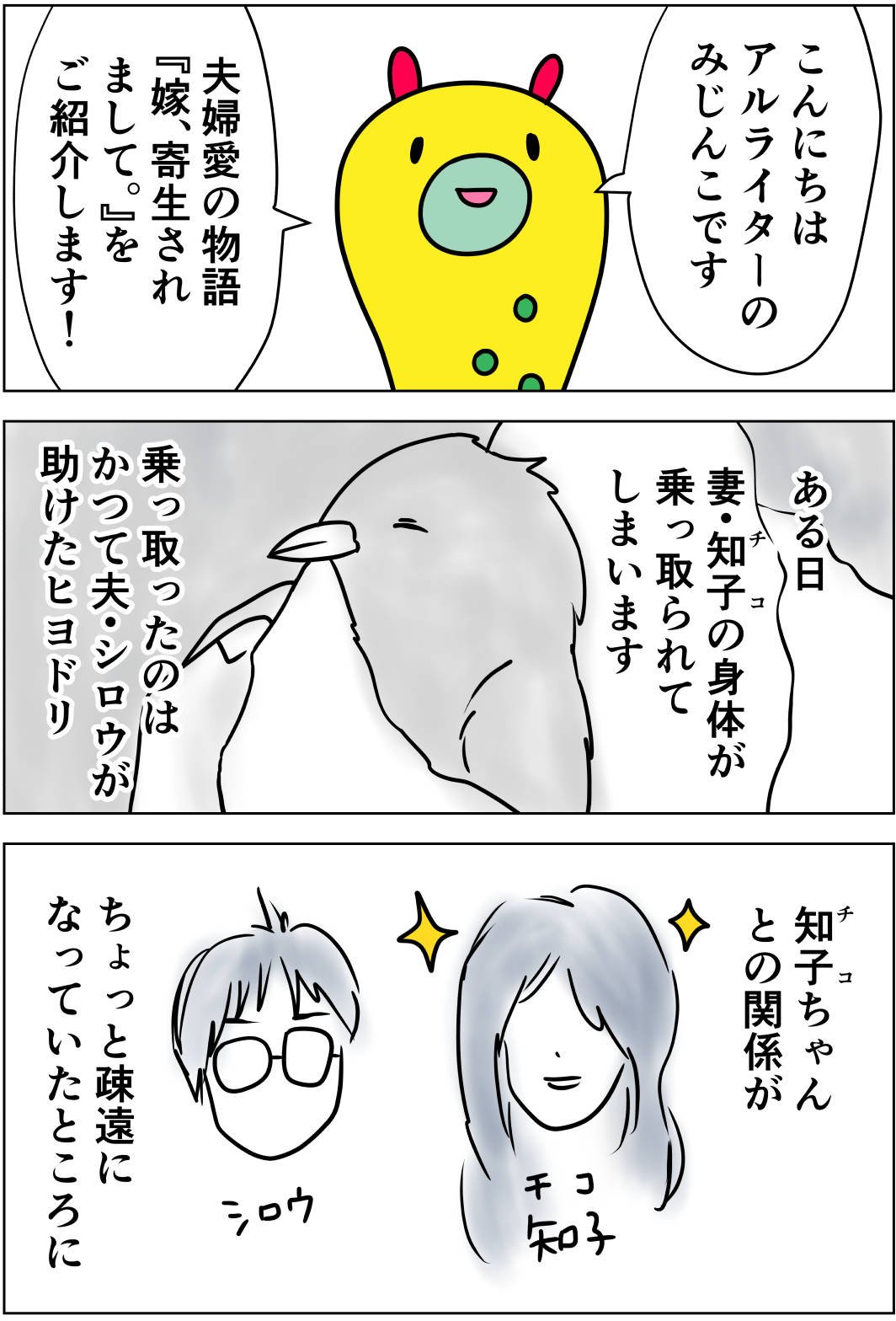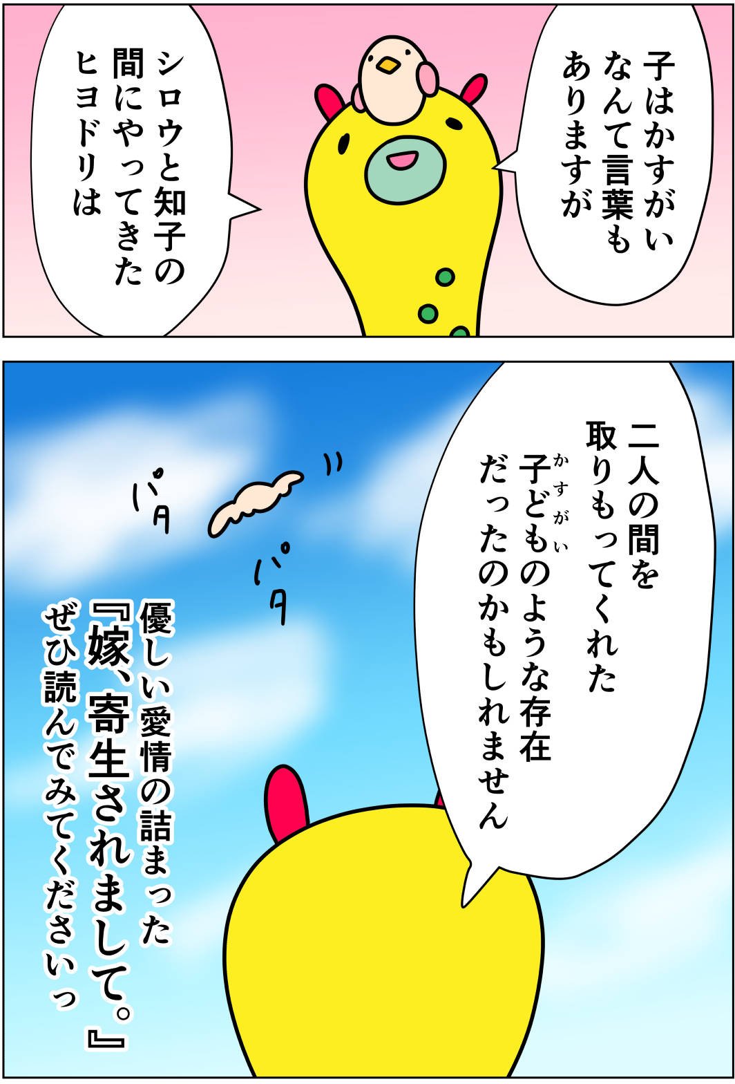 ナガキペソペソ先生の『嫁、寄生されまして。』は、妻とヒヨドリと夫との不思議な三角関係を描いたラブストーリーです。