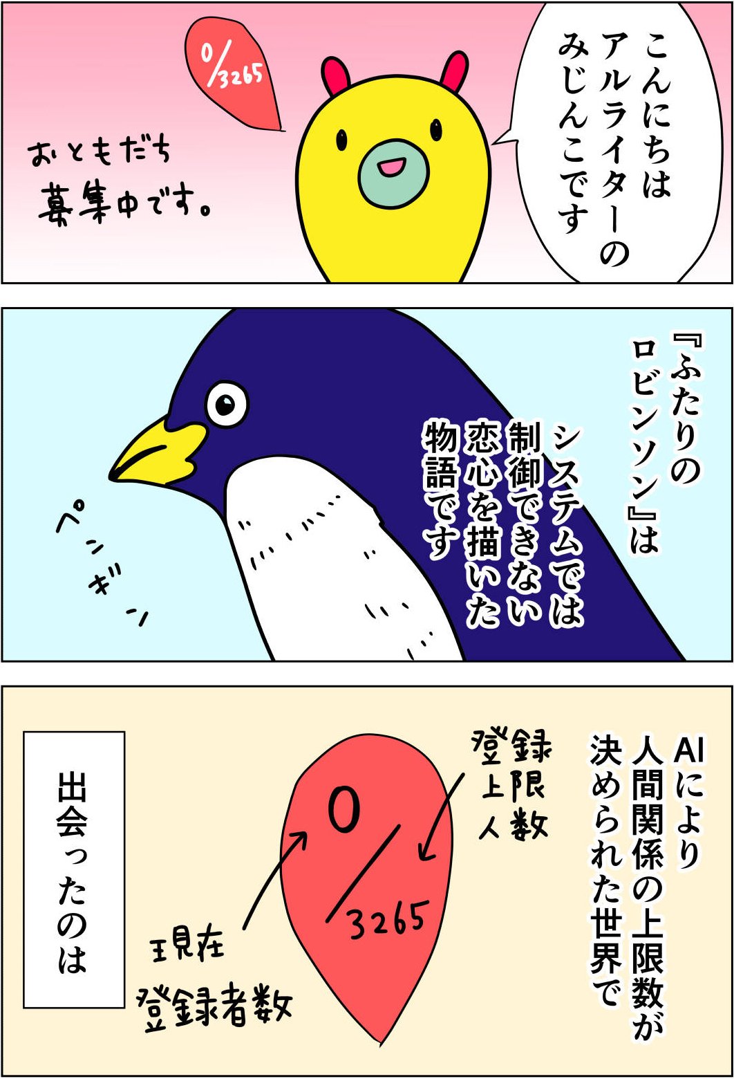 凪松ひろ先生の『ふたりのロビンソン』は、AIによって人間関係の上限数が自動制御された世界で、上限数が0の青年と上限数が多い女性が出会い、システムを超えた関係を築き始める優しいラブストーリーです。