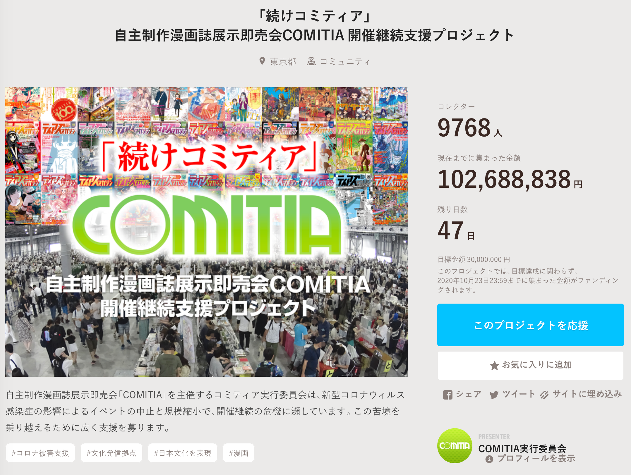 ▼「続けコミティア」自主制作漫画誌展示即売会COMITIA 開催継続支援プロジェクトページ