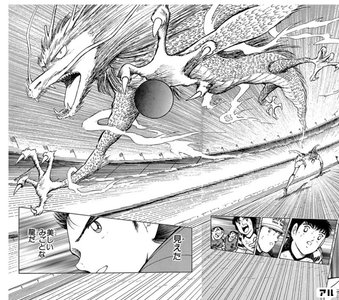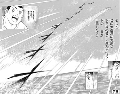 『キャプテン翼 ワールドユース編』からはこちら。中国ユース代表選手、肖俊光の得意技である「反動蹴速迅砲」によって見える美しい龍です。