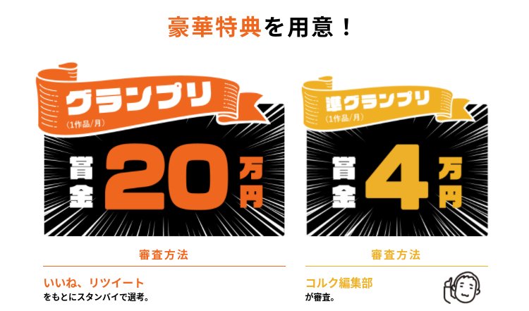 このコンテストで必ず1つの作品が「週刊ヤングジャンプ」に掲載されます!さらに、毎月継続して投稿をすれば、誰でもコルク編集部から直接フィードバックをもらえることができます。漫画家の方はこの貴重な機会をお見逃しなく!
