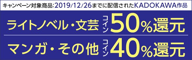 KADOKAWAが2019年12月26日までに配信されたKADOKAWA作品のライトノベルや文芸作品を対象に、コイン50%還元&マンガ作品などその他ジャンルもコイン40%還元キャンペーンを本日から開始しました!