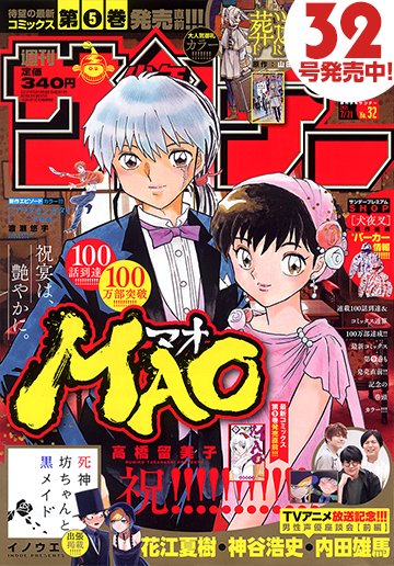 表紙には、連載100話到達&コミックス通算100万部突破の『MAO』から大正ロマンを感じるレトロな装いの2人が登場です。