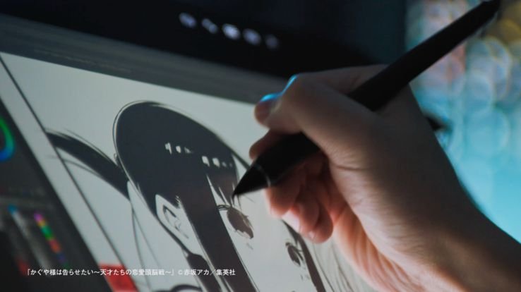 3人目に映し出されたのは『かぐや様は告らせたい〜天才たちの恋愛頭脳戦〜』を描く赤坂アカ先生です。主人公かぐやの特徴的な黒髪が描かれる瞬間が公開されました!尊い!