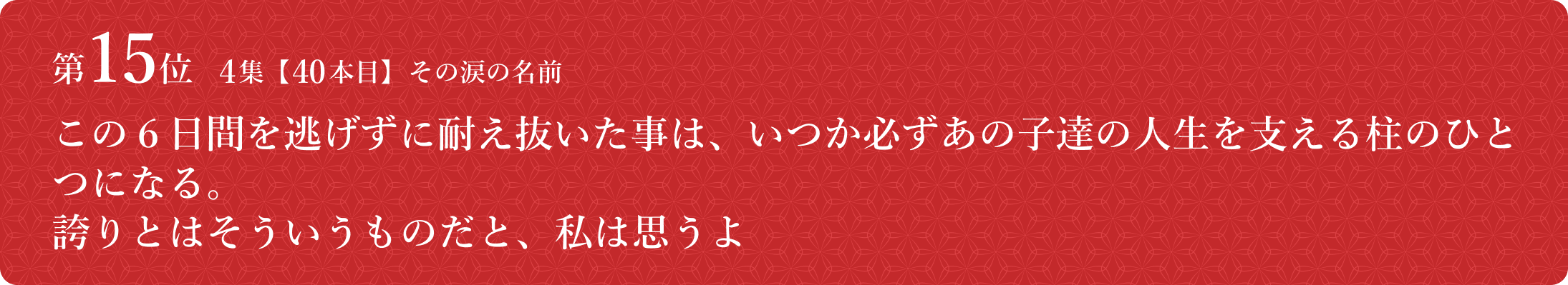 社会人一年目、直属が俗にいうパワハラ上司でした。しんどい時しかありませんでしたが、耐え抜きました。ただ耐え抜いただけで受け身でしたが、このセリフを読んだ時、何年か越しにあの日々を思い出しました。私にとってあの一年間を逃げずに耐え抜いたことは誇りなんだと思えて、涙が止まりませんでした。感謝です(りこさん)