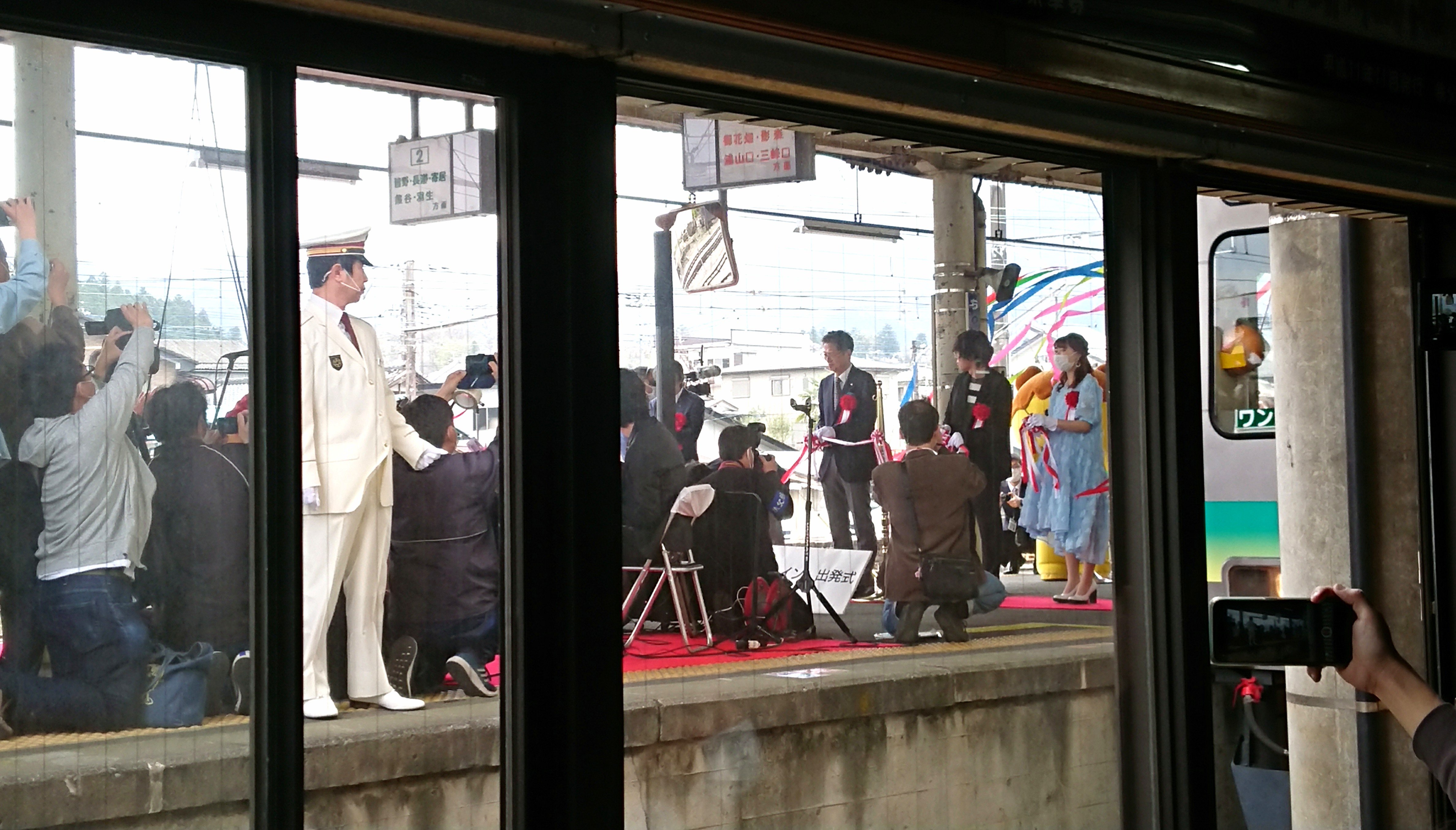 出発式が始まり、テープカットの場面。掛け声とともにテープカット、そしてくす玉が開花し拍手が起こったその直後、謀ったように反対の番線に別の電車が入ってくるという場面も!