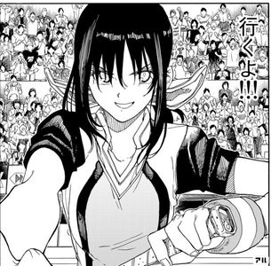 バドミントンは緻密な駆け引きを要求されるスポーツ。主人公の羽咲綾乃は取り分け駆け引き、戦略に長けた選手。よって試合中こんな悪い顔を見せることもしばしば。試合に集中してるからこうなのであって、普段は可愛い良い子なんです、な一コマ