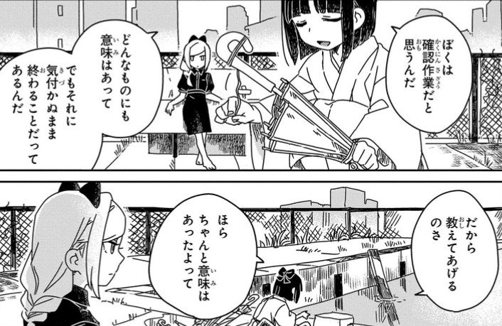けれどもヨミはとてもやさしい神様です。「終末世界」で出会った、命令を失ったロボットのミコを救い、共に旅を続けています。