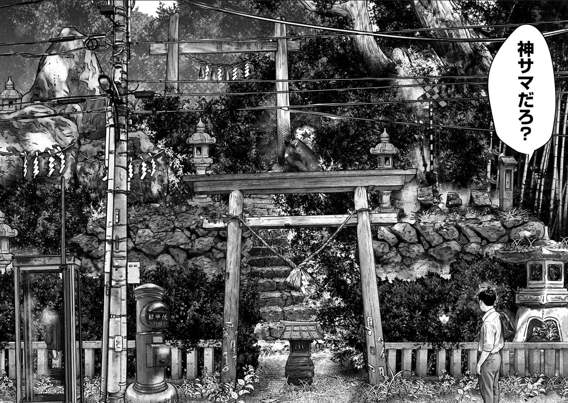 植え込みからひょっこりと顔を出す少女。霊感が強い十蔵は彼女が神様であることに気付きます。植え込みにはまってしまい出られないと困る彼女を助ける十蔵ですが、美しいロングの黒髪をなびかせ、ぱっちり二重のキラキラした瞳を持つ"神級に可愛い"容姿に釘付けになります。