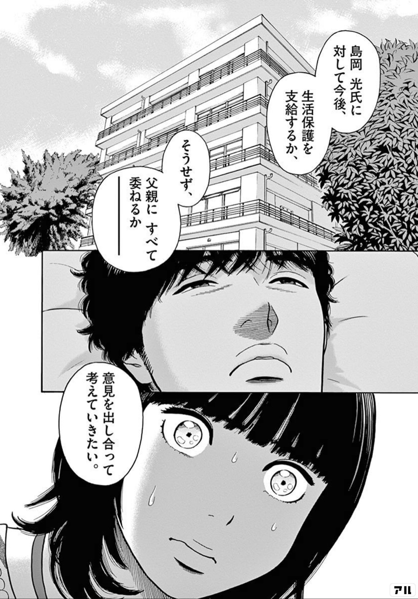 セリフ: 島岡 光氏に対して今後、生活保護を支給するか、そうせず、父親に すべて委ねるか意見を出し合って考えていきたい。