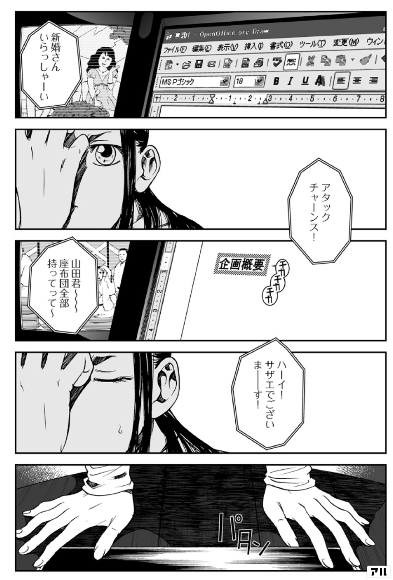 セリフ: OpenOffice org Drawファイル(E) 編集(E) 表示 挿入 書式O ツール 変更 ウィンMS PゴシックBIUAH2 1.X.1企画概要アタックチャーンス!くートーサザエでござい一トーiHE4.*3. 2..1新婚さんいらっしゃーい山田君~座布団全部持ってって~