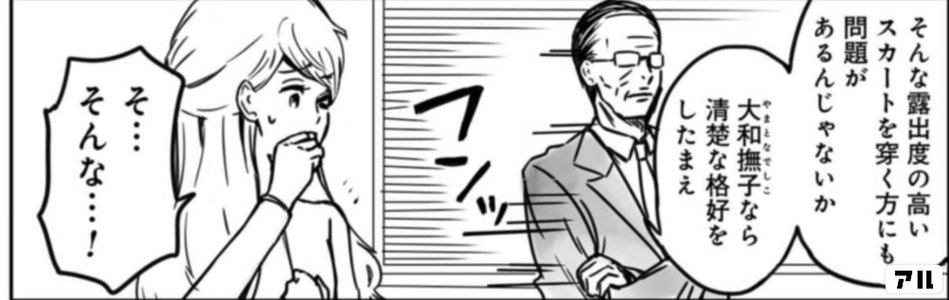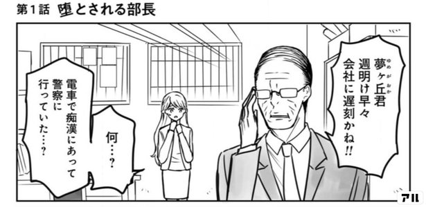 第一話の冒頭から痴漢に遭遇し遅刻してきた女性社員の夢ケ丘に対して「そんな露出度の高いスカートを履いているのが悪い」とモラハラ発言をします。