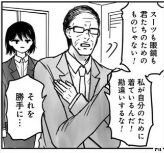 部長も唐突な発言に理由を尋ねると岡磯部は「部長がスーツで眼鏡だから悪いんです」と返します。