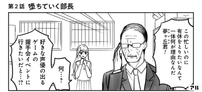 同人誌のネタにされた部長。今度は乙女ゲームに出演する声優のイベントの為に有給を取りたいと言う夢ケ丘に「子供じみたものの為に有給を使うな」と文句を言うと、再び岡磯辺が登場しその乙女ゲームをプレイすることをほぼ強制的に勧められます。