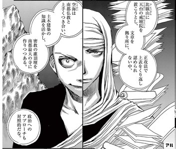 日本国内の仏教の限界に早々に気づいてしまった2人は、海を渡り唐を目指し、そこで出会った「密教」に魅入られて日本に持ち込みます。時の朝廷、桓武天皇が病に伏せてしまい満足な学びを得られないまま帰国することになった最澄は、自分が定めた正しさに苦しめられながらも、正攻法で天台法華を広めるために朝廷に交渉する一方で、朝廷からは天台法華ではなく、密教を広めるように圧力をかけられていきます。