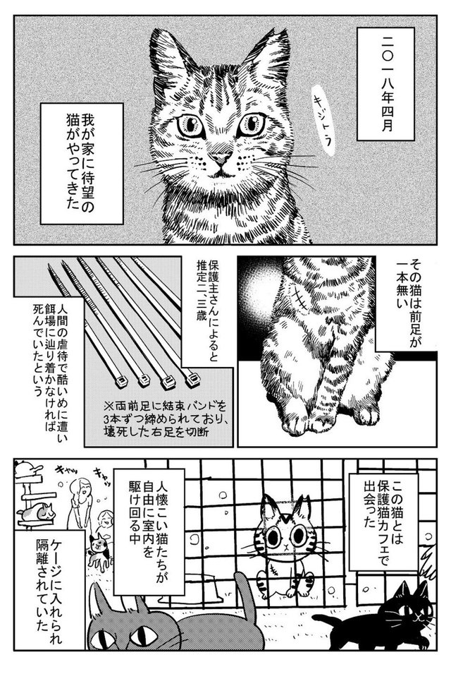 猫の「しじみ」は過去に人間から虐待を受けたことで右前脚を失ってしまった経験を持ちながら、とても人懐っこい性格です。『3本足のしじみちゃん』では、天道先生と同居人さん、しじみの生活の様子が描かれます。